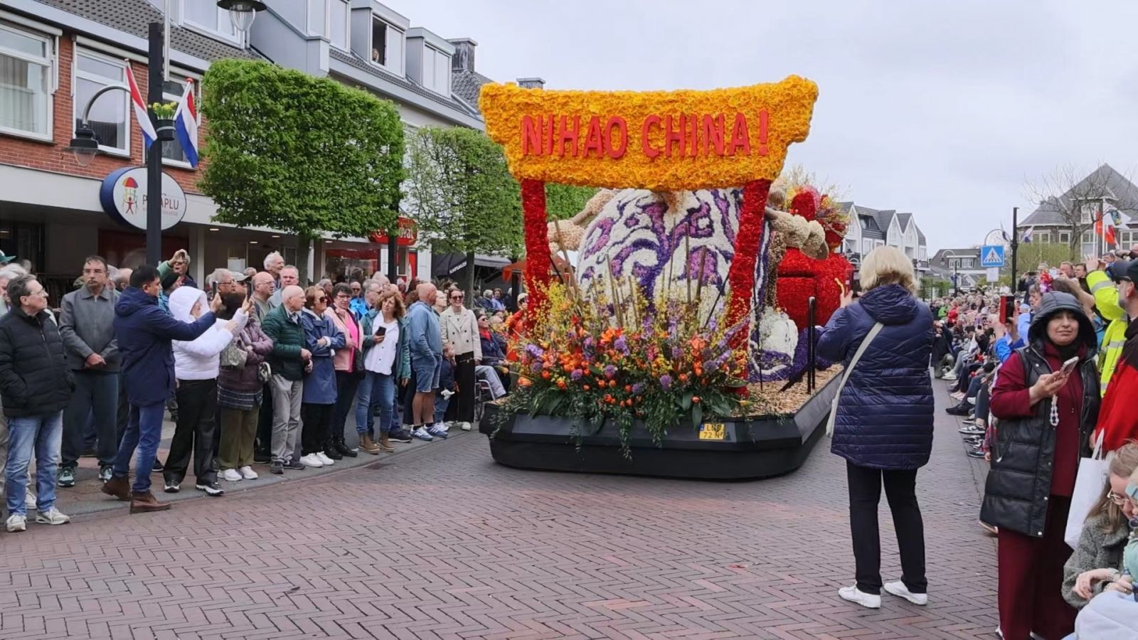 Op 18 april ging de 79e editie van het Nederlandse Bloemencorso feestelijk van start. In totaal namen 15 praalwagens deel en trokken meer dan een miljoen toeschouwers langs de route. De Chinese thematische praalwagen, ontworpen door het China Cultureel Centrum in Den Haag, maakte een indrukwekkende verschijning. Met porselein als inspiratie en rijke bloemendecoraties bracht de wagen een warme uitnodiging “Hallo China” aan het Nederlandse publiek en liet zij op levendige wijze de diepgewortelde culturele uitwisseling tussen China en Nederland zien. De wagen werd bovendien bijna drie minuten lang uitgelicht in een live-uitzending van de Nederlandse televisie, waardoor dit culturele verhaal een breder publiek bereikte.