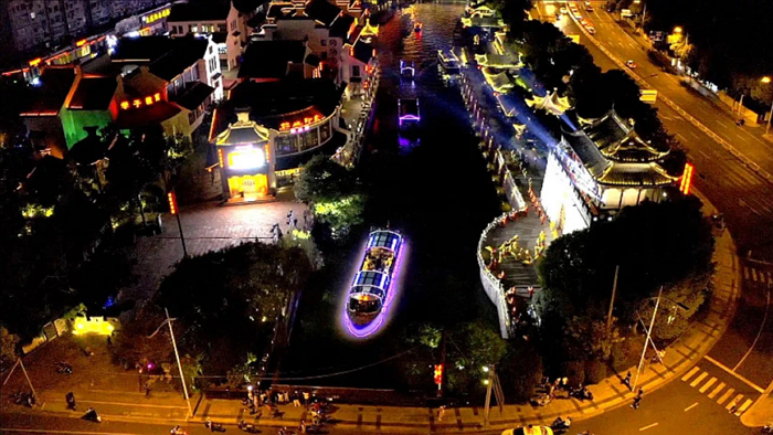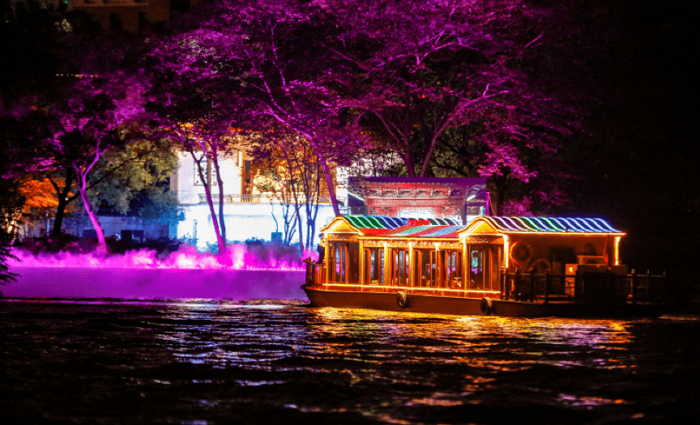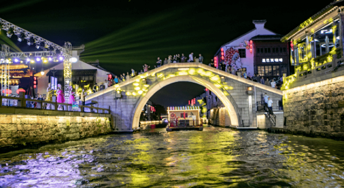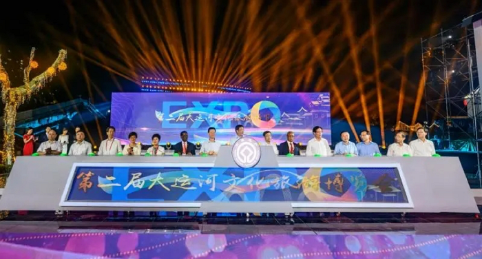 开幕式前,中外嘉宾乘坐江南画舫夜游运河,观看运河两岸缤纷多彩的实景演出和灯光秀,饱览江南丝竹、名画投影、龙凤呈祥、《绣娘》舞蹈和吴歌对唱等江南古运河独特魅力的文化和旅游活动。