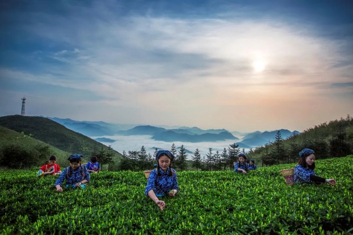 Tea-picking girls at Yuntaishan Scenic Area, Anhua