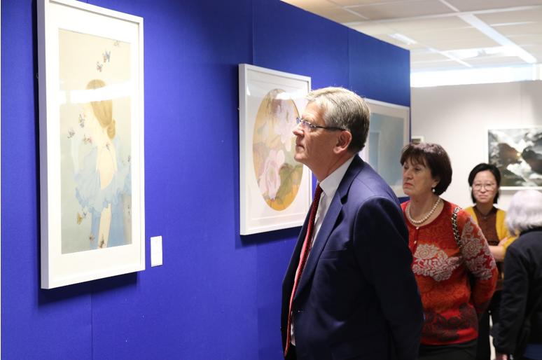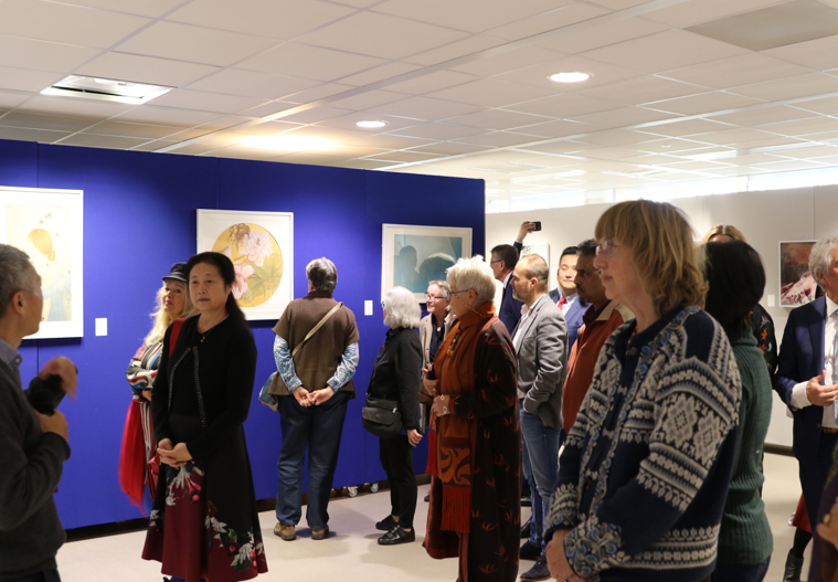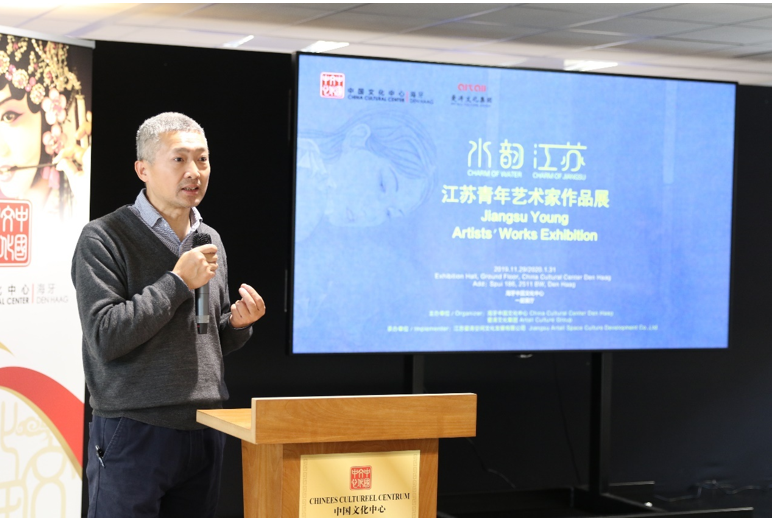 开幕式由海牙中国文化中心黄宏昌主任主持。他首先热情欢迎嘉宾的到来,并为来宾们介绍了此次展览的由来和主题。“水韵江苏——江苏青年艺术家作品展”是中心2019年度最后一个计划内的展览项目。中心委托本次展览联合主办方爱涛文化集团从江苏全省40多位青年艺术家近年创作的120多幅作品中,以作品的原创性、艺术性、主题创意、绘画技巧等为标准,精选出25幅优秀作品参展。作品包含中国水墨画、工笔画、油画、纸本釉彩和综合材料等不同的绘画种类,从多方位展现中国元素在艺术作品中的应用与呈现,让荷兰当地的中国书画爱好者了解当代中国艺术家的艺术表现形式,进一步的促进了中荷艺术家相互交流学习。