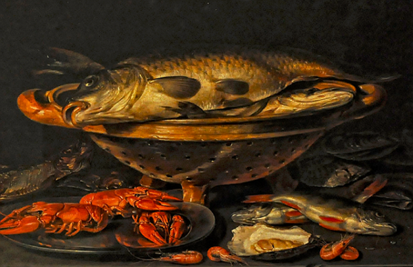 到了17世纪黄金时期,鱼的形象更多出现在荷兰绘画作品,尤其是静物画中,反映了当时富有阶层的日常生活,它的浓墨重彩的油画作法,与中国清淡优雅的写意画法完全不同。作为弗拉芒巴洛克艺术先驱之一的Clara Peeters (1594 – 1657),作品中更是多次画到了鱼虾。
