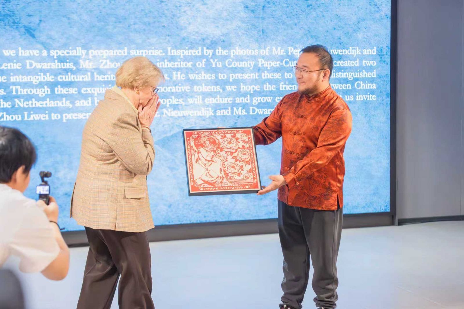 Papercutting-meester Zhou Liwei schonk speciaal gemaakte papercutting-kunstwerken, geïnspireerd op de beeltenissen van Dr. de Rooij en Nieuwendijk, en symboliseerde hiermee de vriendschap tussen China en Nederland. Beide gasten waren aangenaam verrast, spraken hun bewondering uit voor het verfijnde vakmanschap en zeiden dat zij de kunstwerken zorgvuldig zouden bewaren en deze mooie wens uit China met familie en vrienden zullen delen.