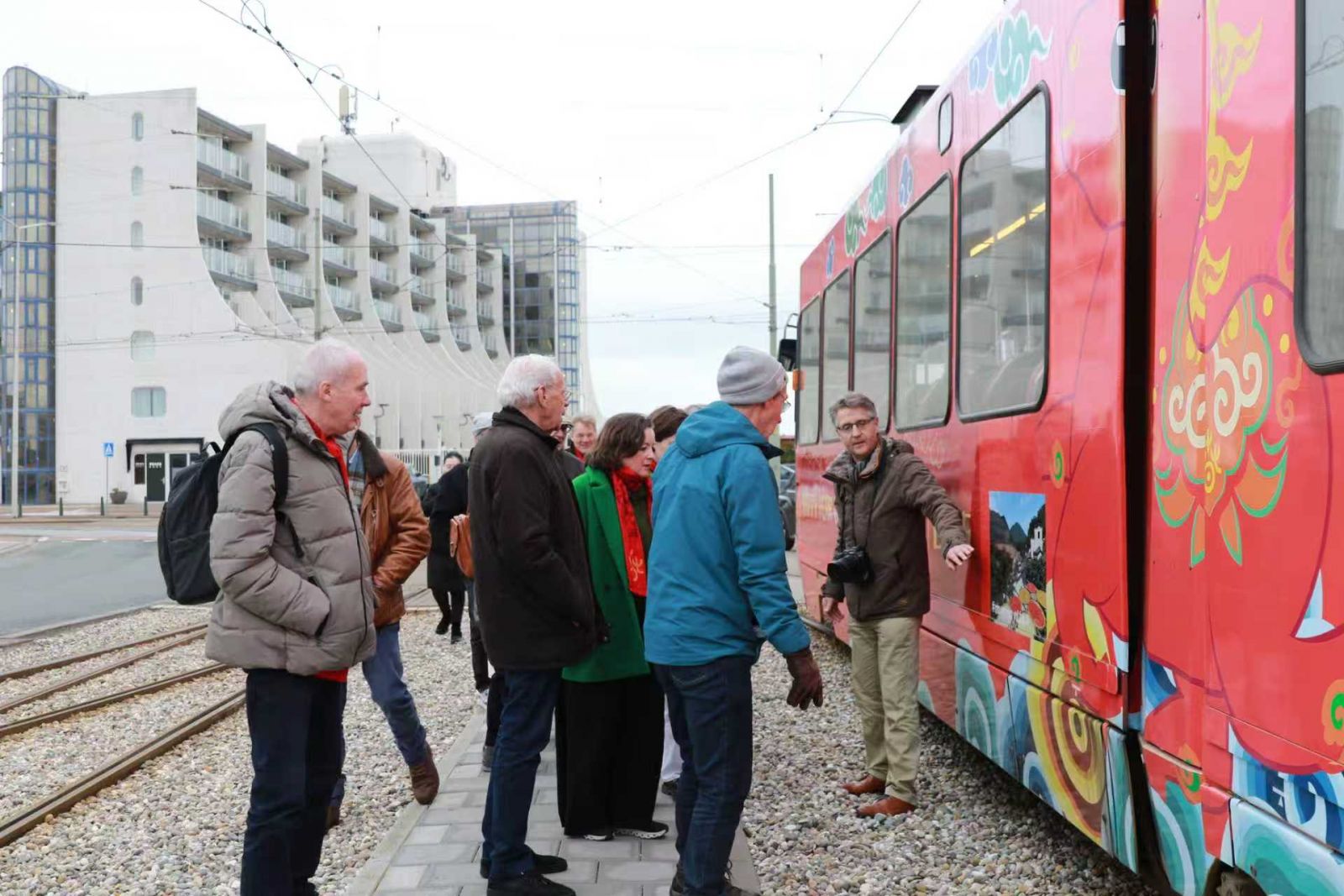 Bij aankomst op het eindpunt Scheveningen Strand gaf de heer Lops tijdens de overstaptijd uitleg over het ontwerp van de beschildering. Van het paardenmotief van het dierenriemjaar, symbool voor geluk en harmonie, tot het logo “Hello! China” en de vriendelijke panda-elementen: elk detail draagt nieuwjaarswensen uit. Bijzonder opvallend zijn de acht fotowerken aan beide zijden van de tram, allemaal door de heer Lops gemaakt tijdens zijn meerdere bezoeken aan China vorig jaar. Indrukwekkende natuur, rijke cultuur, de energie van moderne steden en de rust van het platteland worden levendig weergegeven, wat veel belangstelling trok van omstanders die naar zijn toelichting luisterden.